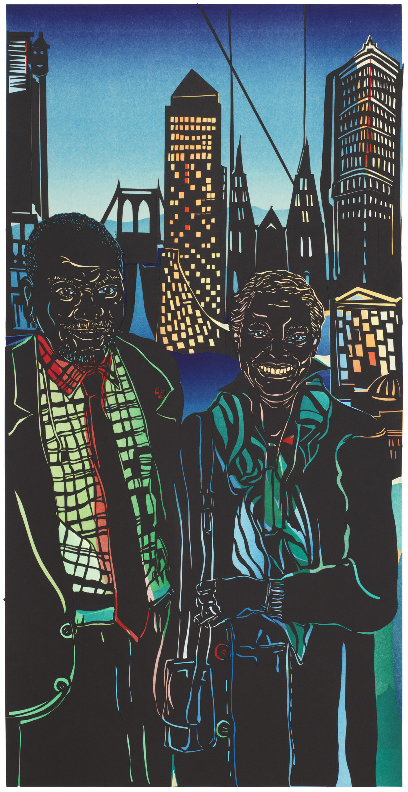 Cut paper and hand-printed color, 29 x 56.5 inches